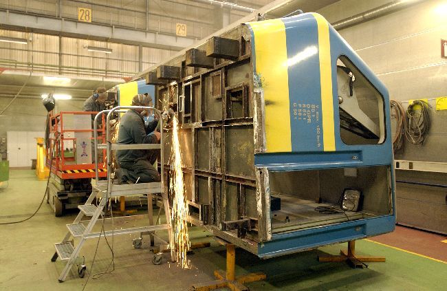 De groep bevat vier digitale foto's. In de centrale werkplaats Salzinnes is een technieker aan het werk in de plaatwerkerij van de voornaamste herstellingslijn (hal 8). Met behulp van een slijpschijf verwijdert hij de lasbramen aan de onderkant van de stuurpost van een elektrische locomotief reeks 27.