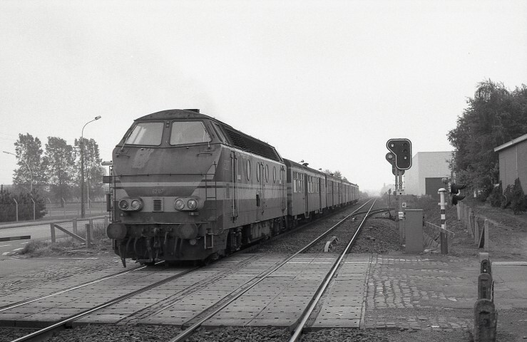 BeschrijvingDeze locomotief behoort tot de reeks 62. Hij rijdt met een sleep M 2-rijtuigen over een bewaakte overweg. Rechts zien we een stopsein type II.