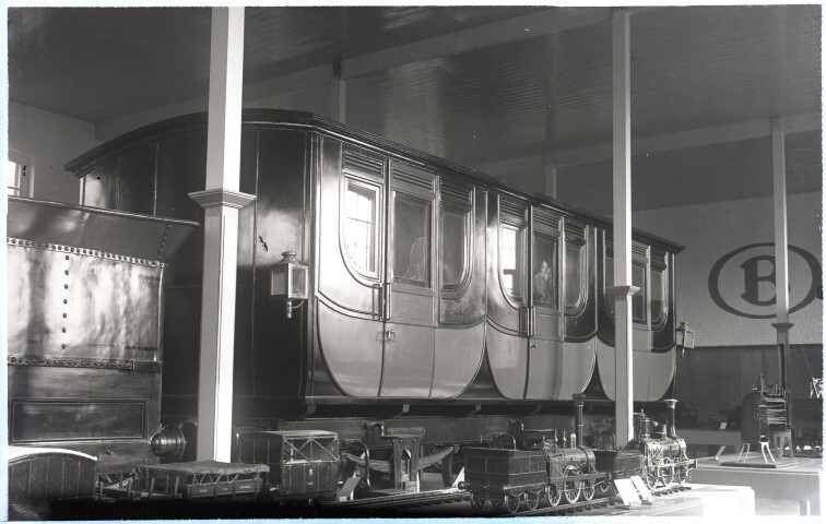 De foto toont een diligence-rijtuig uit 1835 achter een tender. Vermoedelijk betreft het een replica die tijdens de bombardementen in 1944 grondig vernield werd. Op de voorgrond staan schaalmodellen van wagens en stoomlocomotieven. Tegen de muur zien we het logo van de NMBS.