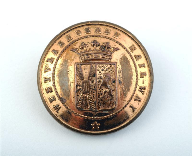 BeschrijvingIn het veld een gekroond wapenschild, over de omtrek 'Westvlaenderen Rail-way'. Op de achterzijde van de knoop is een adelaar afgebeeld en staat het opschrift 'Ia Qualität'.