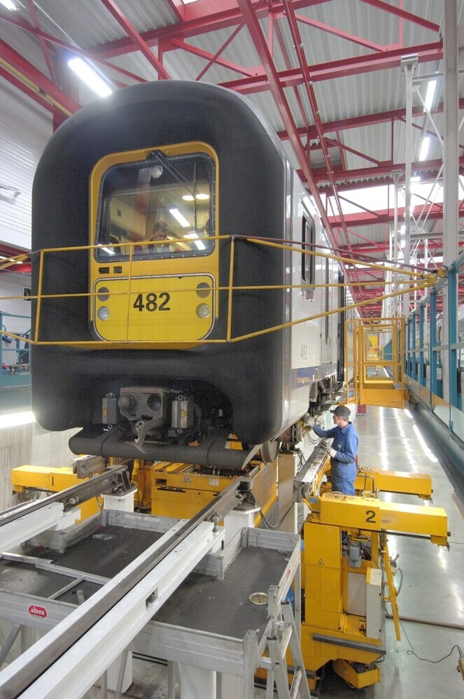 De groep bevat 32 digitale foto's. De techniekers in de tractiewerkplaats Oostende zijn bezig met het onderhoud van elektrisch motorstel 482. Dankzij sporen op palen, de wielendaler en de bovengrondse wieldraaibank beschikt de werkplaats over een snel wielwisselsysteem.