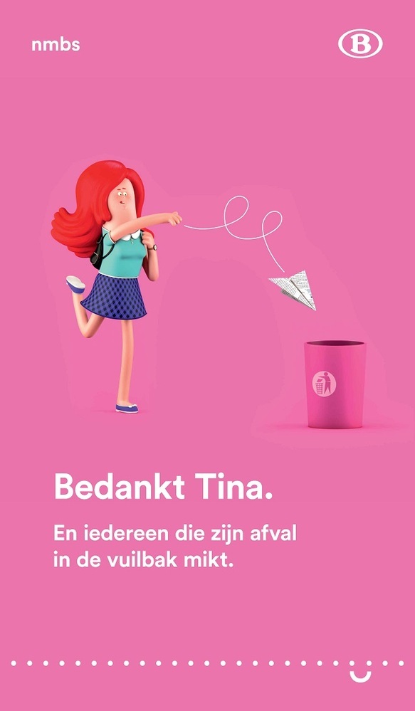 Deze roze affiche wil reizigers sensibiliseren om hun afval in de vuilnisbakken te gooien zodat de stations proper blijven. We zien centraal een afbeelding van een vrouw die een papieren vliegtuig naar een vuilnisbak gooit. Daaronder staat de titel in witte letters. Bovenaan staat ‘nmbs’ en het logo van de NMBS.