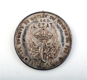 BeschrijvingRond insigne met in het veld een gevleugeld en gekroond wiel en over de omtrek 'Les hommes de métier du Chemin de fer de l'État Belge'. Onder de linkervleugel staat de naam H. Gérard. De pin op de achterzijde is afgebroken.