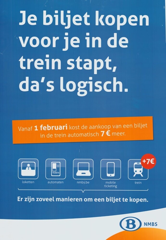 Deze blauwe affiche maakt deel uit van een sensibiliseringscampagne die reizigers wil aanmoedigen hun vervoersbewijzen te kopen vooraleer ze de trein opstappen. De affiche specifieert met behulp van pictogrammen welke verschillende kanalen er beschikbaar zijn om biljetten te kopen. Ze waarschuwt ook voor het supplement dat betaald moet worden wanneer men het biljet pas op de trein wil kopen: ‘Vanaf 1 februari kost de aankoop van een biljet in de trein automatisch 7 € meer. loketten automaten nmbs.be mobile ticketing trein Er zijn zoveel manieren om een biljet te kopen.’