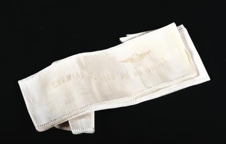 TitelBeige stoffen band met een gevleugeld wiel en opschrift 'Chemins de fer de la Sicile'