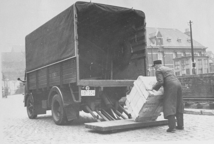 De foto toont een met zeildoek afgeschermde laadbak van een vrachtwagen. Een kruier plaats een houten kist op het neergelaten laadplatform. Op de zijkant van het voertuig staat het logo van de NMBS. Deze vrachtwagen werd gebruikt door de pakjesdienst van de NMBS. Deze dienst haalde en leverde goederen van huis tot huis.