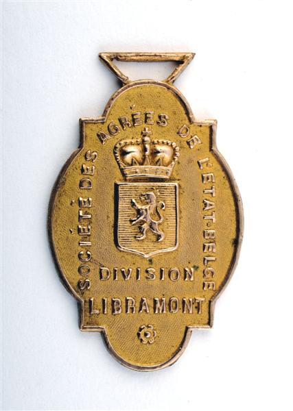 BeschrijvingHanger met in het midden een gekroond wapenschild met de Belgische leeuw en rondom het opschrift 'Société des agrées de l'etat-belge division Libramont'.