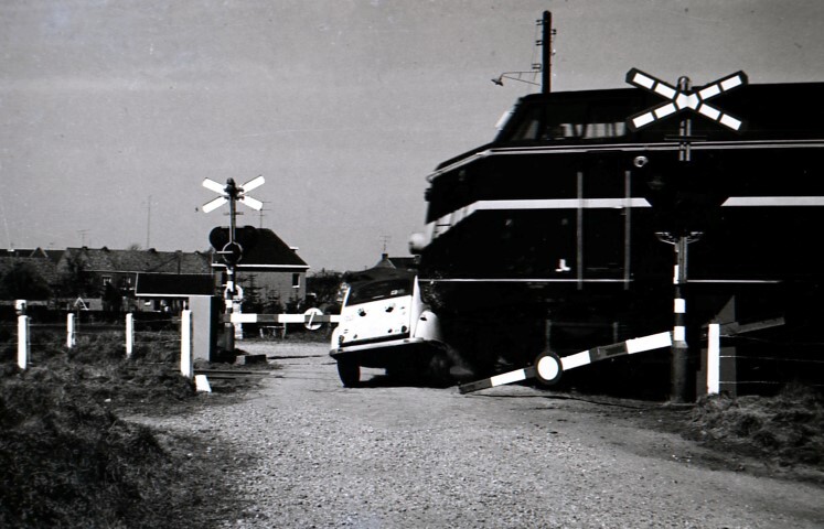 Deze fotogroep bestaat uit 18 negatieven. Ze tonen een Citroën 2 PK die doorheen de gesloten slagboom van een overweg rijdt en tot stilstand komt op de sporen. Hij wordt gegrepen door diesellocomotief nummer 200085 van de reeks 51. De bestuurder heeft zich tijdig uit de voeten kunnen maken voor de aanstormende goederentrein. Op meerdere foto's zien we de resultaten van de aanrijding. Het ongeval werd in scène gezet en gefilmd, vermoedelijk voor een campagne rond veiligheid aan overwegen.