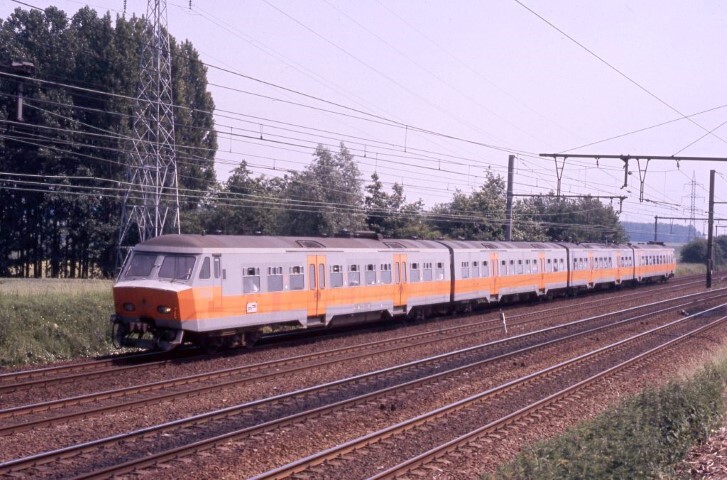 Vierledig elektrisch motorstel 835 op een viersporig traject. Tussen de sporen staat een hectometerpaaltje. Het motorstel behoort tot de reeks 08, schijf 1977. Het heeft nog zijn oorspronkelijke oranje/grijze livrei.