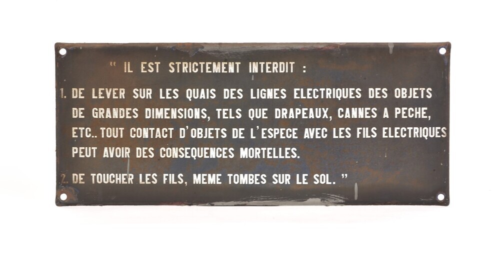 'Il est strictement interdit: 1. De lever sur les quais des lignes electriques des objets de grandes dimensions, tels que drapeaux, cannes a peche, etc.. Tout contact d'objets de l'espece avec les fils electriques peut avoir des consequences mortelles. 2. De toucher les fils, meme tombes sur le sol.'