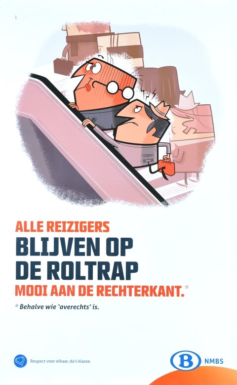 Deze affiche wil reizigers aanmoedigen om steeds rechts te staan op de roltrappen in de stations. Op de witte affiche staat een tekening van een gehaaste man die botst tegen een man die links is blijven staan. Onderaan links staat in blauwe letters: ‘Respect voor elkaar, da's klasse’ en rechts het logo van de NMBS.