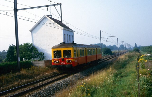 BeschrijvingDe dia toont de motorwagen bij de passage van het voormalige stationsgebouw van Velm. Hij is geel en rood geschilderd.