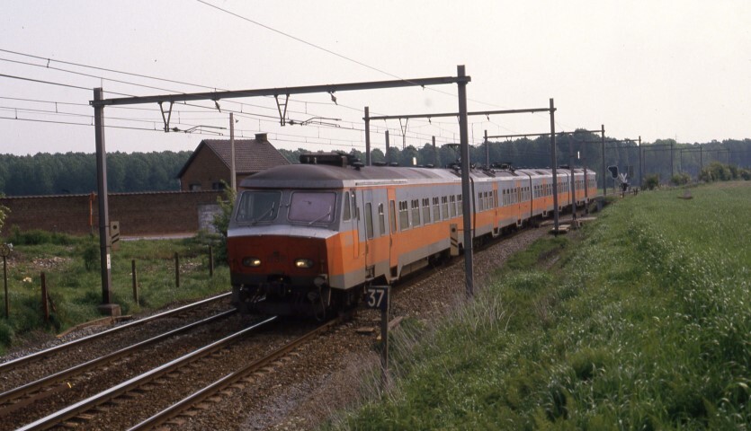 Deze fotogroep bevat drie dia's. Vierledig motorstel 836 rijdt op volle baan in een landelijke omgeving. Op de eerste foto zien we rechts naast het spoor een kilometerpaal. Aan de bovenleidingsmast zijn aan beide zijden seinbakens aangebracht. Motorstel 836 behoort tot de reeks 08, schijf 1977. Schenking van Myriam Hendrickx.