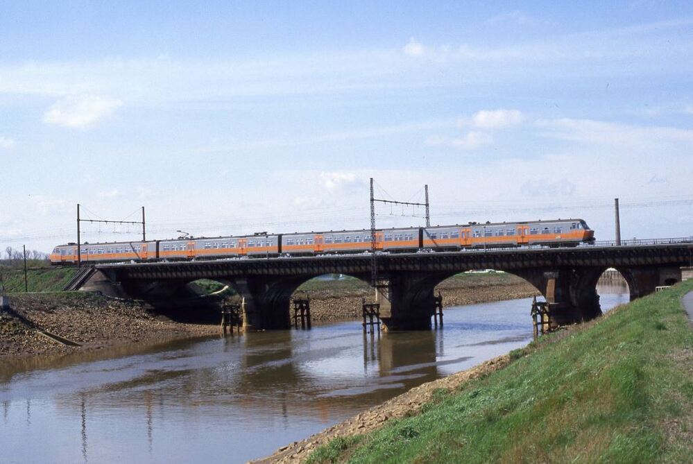Deze fotogroep bevat twee dia's. Vierledig motorstel 835 rijdt over een brug over de Nete. Dit motorstel behoort tot de reeks 08, schijf 1977. Het treinstel heeft een grijs/oranje kleurstelling. Het bovenleidingsportiek op de brug is van het type 1935 in vakwerk. Schenking van Myriam Hendrickx.