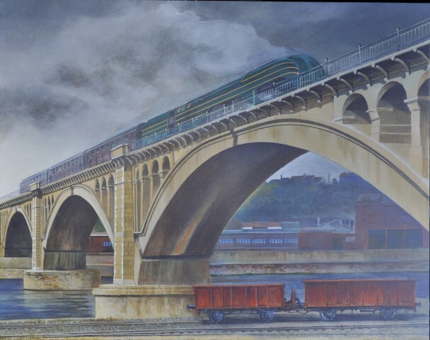 Reproductie van een schilderij. Een stoomlocomotief type 12 (2B1 Atlantic) sleept drie metalen rijtuigen over het viaduct van Renory. Deze brug op lijn 36A bestaat uit negen gewelven van 61,40 m spanwijdte en één van 34 m, in niet-gewapend beton. Langs de oever van de Maas loopt spoorlijn 125 (Luik - Namen). Hierop staan twee rode stortwagens.