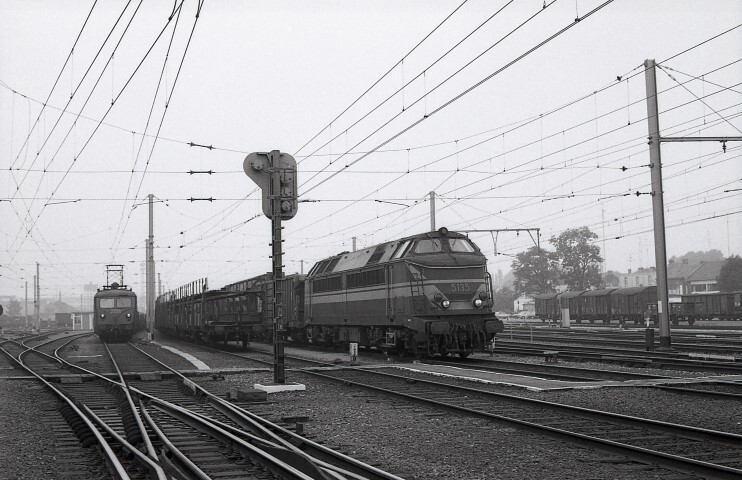 Deze locomotief behoort tot de reeks 51. Ze heeft een goederentrein aan de haak. De trein staat opgesteld in de bundel van het station. Links zien we elektrische locomotief 2358, ook met een goederentrein. Op het spoor tussen de twee treinen staan goederenwagens voor vervoer van auto's opgesteld. Verder zien we op de voorgrond een Engelse wissel met daarachter een stopsein type II. Schenking van Myriam Hendrickx.
