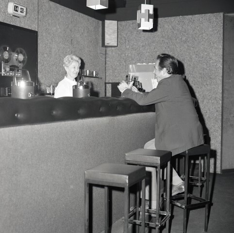 BeschrijvingDeze fotogroep bestaat uit twee negatieven. Ze tonen een stationsbuffet waar een klant met de uitbaatster een praatje maakt. Tegen de muur hangen een klok, een luidspreker en een bandrecorder.