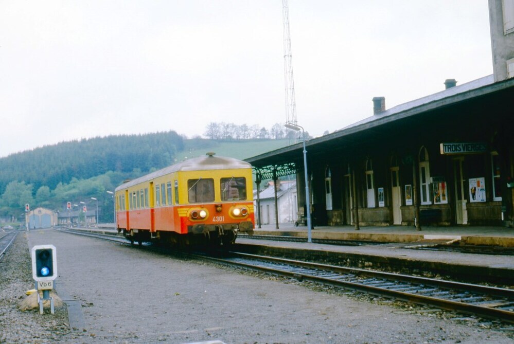 Deze fotogroep bevat vijf dia's. Motorwagen 4301 staat aan het perron van station Troisvierges. Rechts zien we het stationsgebouw. Het perron met zitbanken en verlichting is overdekt met een luifel. Op de achtergrond zien we lichtseinen en een stelplaats. Schenking van Myriam Hendrickx.