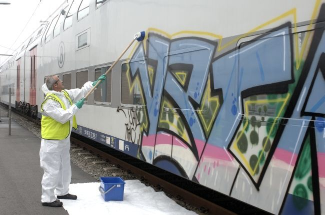De groep bevat 22 digitale foto's. Twee personeelsleden van de Technische Onderhoudspost (TOP) Schaarbeek verwijderen de graffiti van een M 6-rijtuig. Zij dragen beschermende kledij. Eerst wordt een schoonmaakproduct aangebracht met behulp van borstels. Daarna worden de moeilijke vlekken met een krabber en spons bewerkt. En tot slot wordt de trein met water gereinigd.