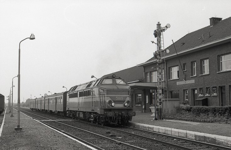 Deze fotogroep bevat zes negatieven. Ze tonen diesellocomotief 5189 met drie M 2-rijtuigen. Rechts zien we het stationsgebouw en op het perron ook een mechanisch sein van het tweestandenstelsel.