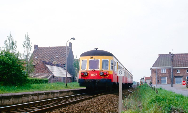 Motorwagen 4007 rijdt voorbij een bewaakte overweg station Veldegem binnen. Op het perron links staat verlichting en op de voorgrond zien we een hectometerpaal met de vermelding '6'. Deze stopplaats ligt langs lijn 66 (Brugge - Kortrijk). Schenking van Myriam Hendrickx.