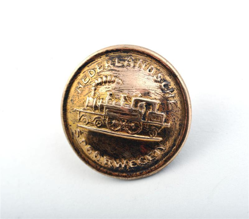 BeschrijvingRonde uniformknoop met in het veld een stoomlocomotief naar links. Over de omtrek 'Nederlandsche Spoorwegen'.