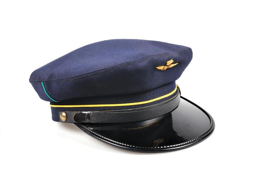 BeschrijvingDonkerblauwe dienstpet met zwarte klep in kunststof. De zwarte leren stormband is vastgemaakt met twee ronde metalen knopen. Er loopt een gele bies op 2 cm boven de rand en een enkele groene verticale streep aan beide zijden. Vooraan is een spoorweginsigne bevestigd. De pet is verstevigd met een leren band en de voering is zwart.
