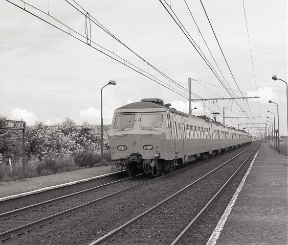 Dit motorstel behoort tot de reeks 08 schijf 1976. Het vormt samen met motorstel 804 een reizigerstrein. Bemerk dat dit motorstel nog niet voorzien is van een baanruimer. Links op het perron zien we het stationsnaambord. Schenking van Myriam Hendrickx.