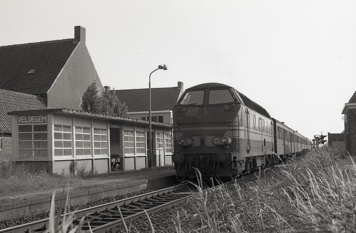 BeschrijvingDeze locomotief behoort tot de reeks 63 en heeft M 2-rijtuigen aan de haak. Links zien we een betonnen schuilhuisje met op de zijkant de stationsnaam geschreven.