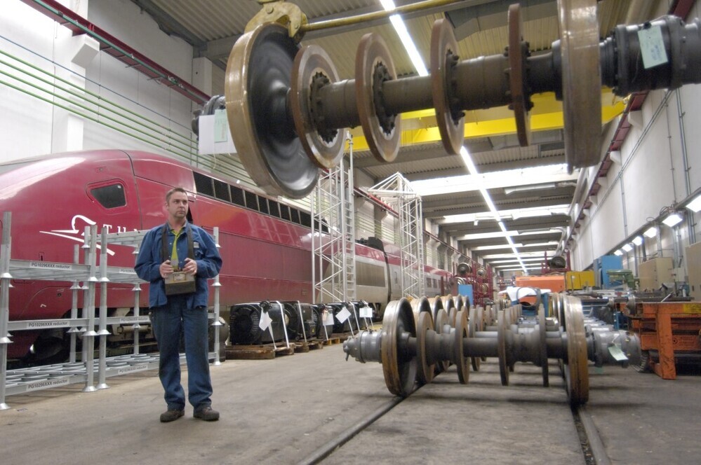 De groep bevat 17 digitale foto's. Een eerste technicus-elektromecanicien in de Tractiewerkplaats HST Vorst selecteert een wielas voor een Thalys. Zijn collega's kijken het interieur na. Ze doen de nodige herstellingen aan de tafelverlichting.