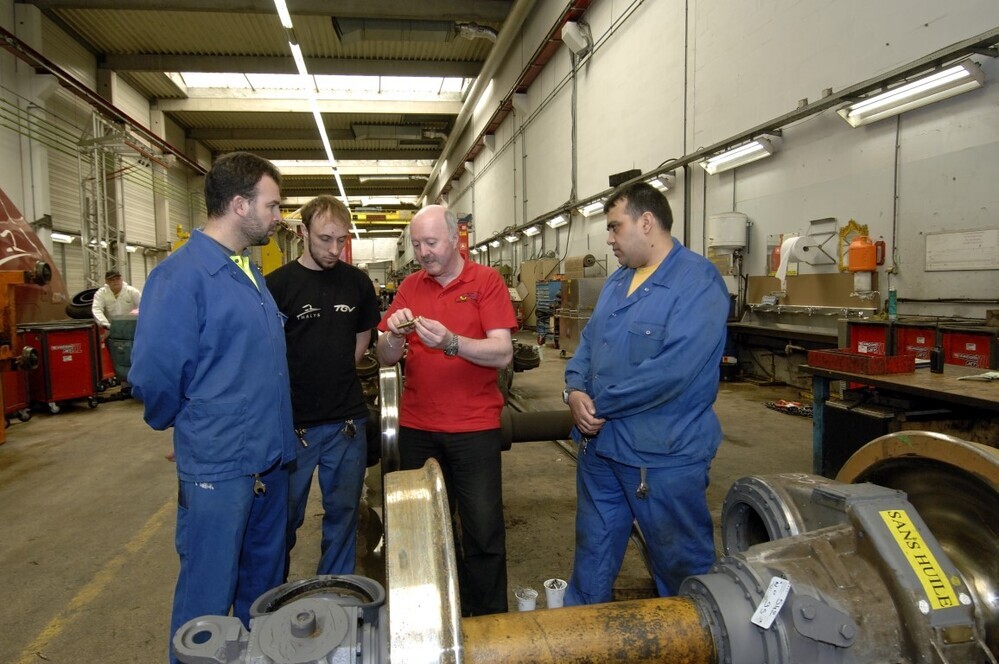 BeschrijvingDe groep bevat 22 digitale foto's. Een aantal personeelsleden krijgen vakopleiding in de tractiewerkplaats HST Vorst. Na de uitleg door een instructeur moeten ze zelf aan de slag met een wielas.