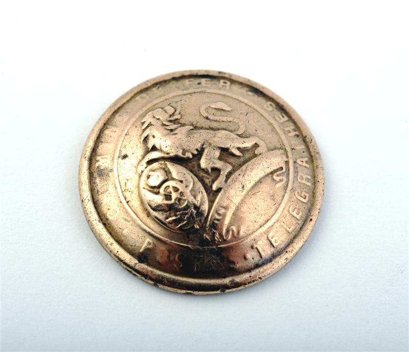 Ronde uniformknoop met in het veld een leeuw die een schild vasthoudt met daarop de kentekens van de spoorweg, post en telegraaf op afgebeeld. De leeuw staat op een wimpel met de tekst 'l'Union fait la force'. Over de omtrek 'Chemins de fer, postes et telegraphes". Schenking van dhr. Ilias.