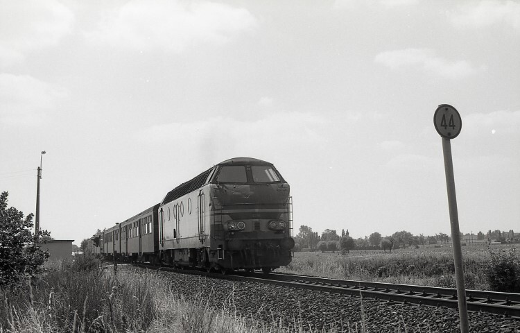Deze locomotief behoort tot de reeks 63. Ze heeft M 2-rijtuigen aan de haak. Het paaltje rechts duidt het nummer van een overweg aan, in dit geval overweg 44. Oorspronkelijk was de lijn tussen Brugge en Torhout enkelsporig. Schenking van Myriam Hendrickx.