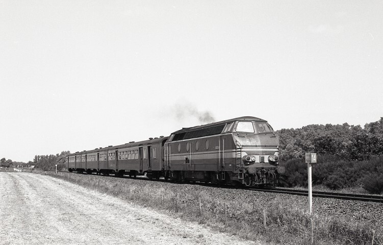 BeschrijvingDeze locomotief behoort tot de reeks 62 en heeft M 3-rijtuigen aan de haak. Rechts zien we kilometerpaal '14'.