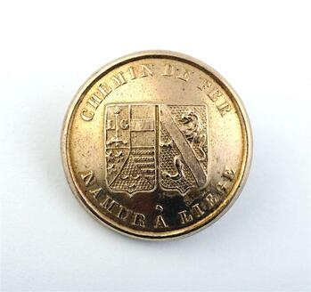 BeschrijvingRonde uniformknoop met in het veld het wapenschild van Namen en dat van Luik. Over de omtrek 'Chemin de fer Namur à Liege'.