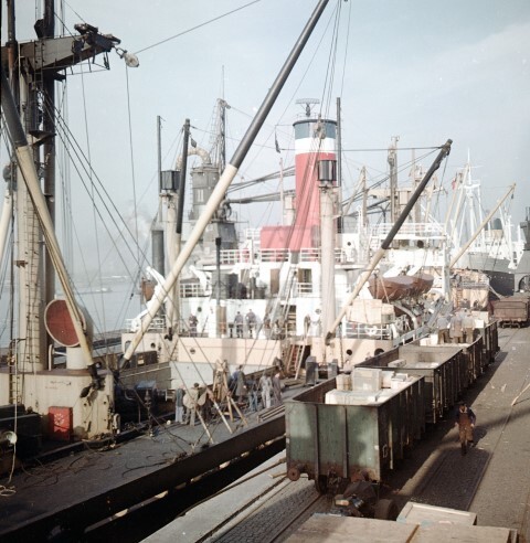 BeschrijvingDeze fotogroep bestaat uit twee negatieven. Ze tonen het lossen van goederen met behulp van laadbomen uit een schip. Op de kade staan open wagens met een hoge wand voor het natransport van het stukgoed.