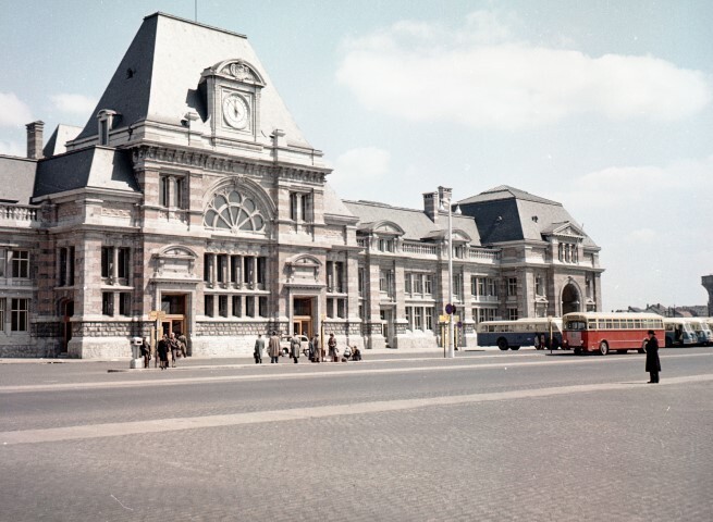 Deze fotogroep bestaat uit twee negatieven. Ze tonen de voorgevel van het station in Vlaamse neorenaissancestijl. Het centrale deel heeft twee toegangsdeuren en is bekroond met een spits tentdak. Boven het halve roosvenster zien we een ornament met stationsklok. Een rood-beige autobus van de Nationale Maatschappij der Buurtspoorwegen (NMVB) rijdt het stationsplein op. Voor het gebouw wachten reizigers op hun aansluiting. Rechts zien we de groen-beige autobussen van de NMBS.