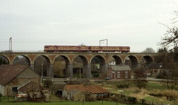 BeschrijvingDeze fotogroep bevat twee dia's. Motorstel 940 (reeks 09, schijf 1989) rijdt over een stenen viaduct.