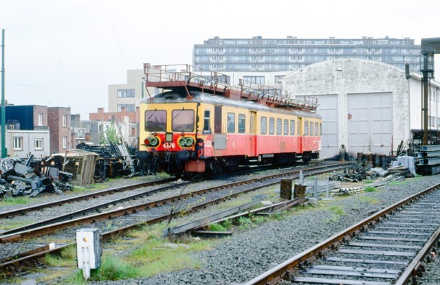 Motorwagen 4326 staat voor een loods in Antwerpen-Oost. Na zijn buitendienststelling in het passagiersvervoer heeft de motorwagen nog een tijdje dienst gedaan voor onderhoudswerkzaamheden, daarom werd bovenop het dak een platform gebouwd. Schenking van Myriam Hendrickx.