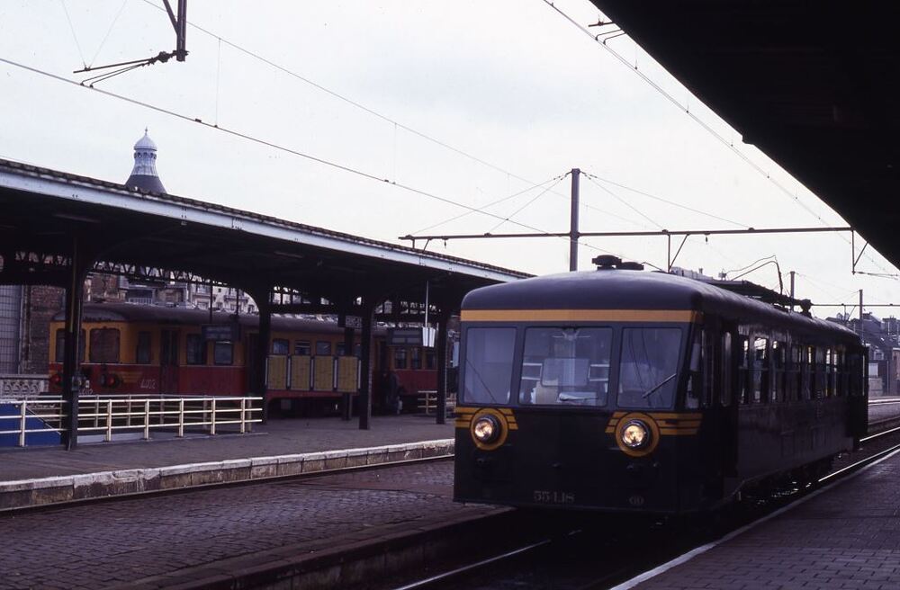 Deze fotogroep bevat vijf dia's. Motorwagen 554.18 staat aan het perron van station Gent-Sint-Pieters. De perrons zijn overdekt met luifels. Op het perron links zien we gele dienstregelingsaffiches, en aan de luifel hangen mechanische treinaankondigers. Een reizigers stapt in motorwagen 4402. Schenking van Myriam Hendrickx.