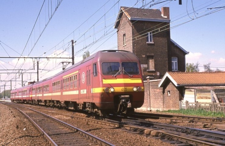 Twee gekoppelde motorstellen reeks 03 'Break', met vooraan motorstel 405, zijn net het station Schellebelle uitgereden. Rechts zien we het eerste stationsgebouw uit 1856, dat later dienstdeed als woning van de stationschef. In de achtergrond zijn ook nog net de perrons van het huidige station zichtbaar. Motorstel 396 en 405 behoren beiden tot de reeks 03, schijf 1983. Schenking van Myriam Hendrickx.