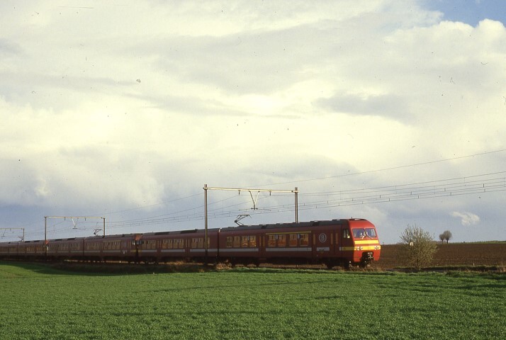 BeschrijvingVier gekoppelde motorstellen reeks 03 'Break' rijden op volle baan in een landelijke omgeving.