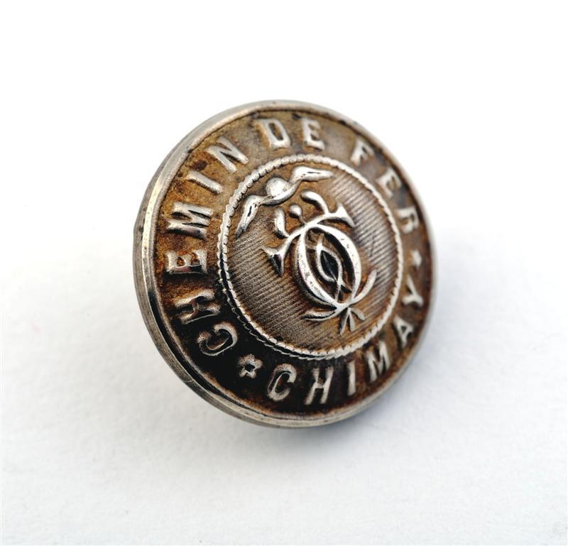 BeschrijvingRonde uniformknoop met in het veld een gevleugelde mercuriusstaf en daarvoor het monogram CC. Over de omtrek 'Chemin de fer - Chimay'.