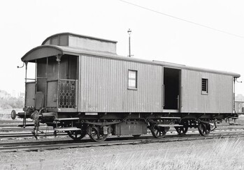 BeschrijvingDe foto toont houten pakwagen 19.074 op drie assen. Dit type rijtuig bevond zich meestal aan de kop van een sleep rijtuigen om in het geval van een aanrijding de schok van de botsing deels op te vangen.