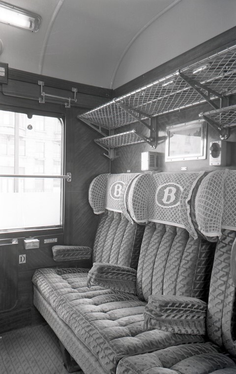 Deze fotogroep bestaat uit twee negatieven. Ze tonen het interieur eerste en tweede klas van een internationaal rijtuig. De zitbanken bestaan uit kussens in fluweel en hebben armsteunen. De rugleuningen zijn overtrokken met kopstukken waarop het NMBS-logo staat. Onder het raam zien we een uitklapbaar tafeltje en twee asbakken. Het raam kan neergeschoven worden en is voorzien van een rolgordijn.
