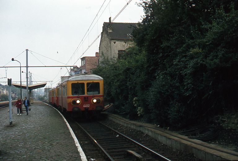 Motorwagens 4402 en 4409 staan aan het perron in het station Laken. De perrons zijn gedeeltelijk overdekt met een luifel. Op de voorgrond tussen de sporen zien we nog net een krokodil. Dit is een veiligheidstoestel dat zich ter hoogte van een sein bevindt. Station Laken ligt langs spoorlijn 50 (Brussel-Noord - Gent-Sint-Pieters). Schenking van Myriam Hendrickx.