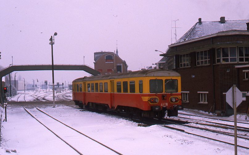 Deze fotogroep bevat drie dia's. Motorwagen 4408 rijdt in een winters landschap het station binnen. Rechts zien we de seinpost en in de achtergrond de perrons. Over de sporen loopt een voetgangersbrug. Dit station ligt langs spoorlijn 89 (Denderleeuw - Oudenaarde - Kortrijk). Op de laatste dia zien we de vertakking naar spoorlijn 86 (Gent-Sint-Pieters - Ronse) in de buurt van het station. Een goederentrein met tremelwagens verdwijnt op dit spoor. Schenking van Myriam Hendrickx.