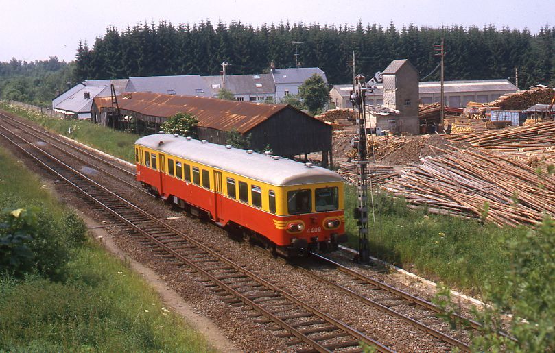 Deze fotogroep bevat drie dia's. Op de eerste twee dia's staat motorwagen 4408 aan een mechanisch sein naast een houtzagerij. Op de laatste dia staat hij naast een ander mechanisch sein. Tussen de sporen zien we een krokodil (veiligheidstoestel). Schenking van Myriam Hendrickx.