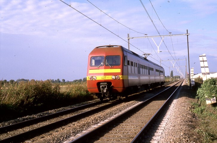 Deze groep bevat twee dia's. Ze tonen tweeledige motorstellen van de reeks 03 'Break' op volle baan. De stellen zijn bordeaux geschilderd, met een brede witte band en gele zichtbaarheidsstrepen. We bevinden ons op Nederlands grondgebied, wat duidelijk te zien is aan de bovenleiding. Rechts staat nog een oud mechanisch sein. De motorstellen 426 en 427 behoren beiden tot de reeks 03, schijf 1983. Schenking van Myriam Hendrickx.