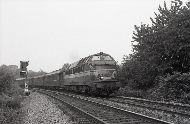 Deze locomotief behoort tot de reeks 51 en heeft K 2-rijtuigen aan de haak. Links zien we een stopsein type III. Dit sein kan een snelheidsbeperking opleggen van 40 km/u. In dit geval zal het cijfer '4' onder de seinplaat oplichten. Vóór het sein en tussen het spoor zien we een 'krokodil' (veiligheidstoestel). Verder zien we onderaan de seinmast een telefoonkast (kast met 'T' erop). Een machinist kan via een telefoon in de kast onmiddellijk in verbinding met een seingever die dit sein beheert. Schenking van Myriam Hendrickx.